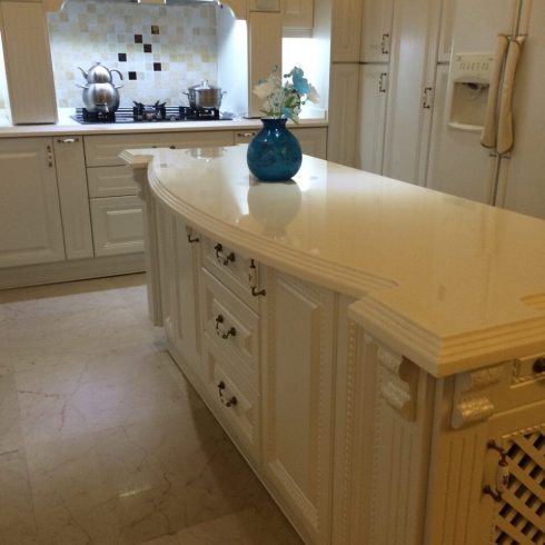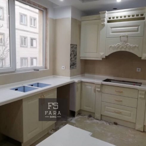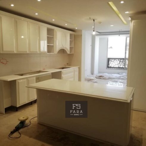 در این قسمت مطالبی در رابطه با مراحل ساخت ، اجرا و نصب سنگ کورین را به صورت آموزشی در اختیار شما عزیزانی که به فرآیند ساخت سنگ کورین علاقه مند هستید ، قرار می دهیم. در مرحله ی ساخت ، دمای کارگاه بسیار مهم است ، بهترین دما برای ساخت و کار بین 15 تا 25 درجه ی سانتی گراد می باشد. صفحات سنگ کورین ، چسب های سنگ کورین و ابزارها باید با دمای ذکر شده هماهنگ باشند. دما و رطوبت در هنگام چسباندن و اتصال ، دو عامل بسیار مهم در استحکام کار و پر کردن درزها به شمار می رود. دما و رطوبت نامناسب باعث دیر خشک شدن چسب ها شده که در نتیجه ی آن عملیات ساخت مدت زمان بیشتری به طول می انجامد و در مراحل درز گیری و چسباندن لبه ها خلل ایجاد می کند. صفحات سنگ کورین نباید در معرض تابش مستقیم آفتاب قرار گیرند و فقط باید به صورت افقی و بدون زاویه قرار داده شوند. همانطور که می دانید رنگ های تیره ، خط وخش و خراشیدگی را بیشتر از کدهای روشن نمایان می کنند پس در هنگام عملیات ساب و پولیشینگ می بایست دقت و توجه بیشتری نمود. محاسبات برش صفحات و محل های برش باید قبل از شروع ساخت به طور دقیق مشخص شوند ، برای مثال نباید به هیج وجه مقاطع برش نزدیک به سینک و گاز باشند چرا که در این مقاطع تحمل وزن به مراتب پایین تر است. برخی از دستگاه ها و ابزارهای مربوط به ساخت و نصب کورین عبارتند از: دستگاه برش صفحات ، اره دیسکی ، اره چکشی ، ماشین سمباده زنی ( ماشین پوست ) ، دستگاه اورفرز ، گیره پیچ دستی ، گیره قفلی ، دلر ، بیسکوییت زن ( دستگاه جفتو جور کن نجاری ) ، شیر پولیش ، نوار چسب آلومینیومی ، سمباده های زبر و نرم ( 80 تا 3000 ) ، پد پولیش و مواد مصرفی دیگر همانطور که ذکر شد محل های برش در یک فرآیند ساخت بسیار اهمیت بالایی دارند ، برای انتخاب بهترین محل برش در صفحات کورین باید به چند نکته توجه کرد که با هم مرور می کنیم. در ابتدا باید اندازه های کلی پروژه به صورتدقیق و میلی متری مشخص شود و ابعاد و اندازه های پروژه شابلون برداری شوند. شابلون برداری از تمامی قسمت ها بسیار دقیق تر از اندازه گیری می باشد چرا که علاوه بر اندازه ها ، همه ی زوایا و به اصطلاح عام ، قناصی ها را نیز نشان می دهد. در مرحله ی بعد باید اندازه ها و شابلون ها را با طول وعرض صفحات سنگ کورین انطباق دهیم و با توجه به در نظر گرفتن مواردی همچون قرار گیری دیوارها و قسمت های باز مانند اوپن ها و جزیره ها ، عملیات برش را آغاز کنیم. برش ها باید به گونه ای زده شود که اتصالات روی ماشین لباسشویی یا ماشین ظرفشویی نباشد. حداقل فاصله ی اتصالات با سینک و گاز باید 30 سانتی متر باشد. برش ها می بایست بر طبق شرایط نصب اعمال شوند. اتصالات الزاما در جایی قرار گیرند که در محل نصب جا و فضای مناسب برای چسب زدن و فشردن دو تکه به همدیگر وجود داشته باشد. در صورتی که قرنیز هم از جنس کورین ( سالید سرفیس ) باشد باید در هنگام برش گاز حداقل فاصله ی 3 سانتی متری را با قرنیز کورین رعایت کرد. به دلیل استفاده از پلیمرها در ساخت و تولید سنگ های کورین این صفحات نباید در معرض مستقیم حرارت و آتش قرار گیرند زیرا قابل اشتعال هستند. محل های برش سینک و گاز باید به طور کامل و اساسی با چسب های سیلیکونی و آکواریوم آب بندی شوند تا از ورود رطوبت و حرارت به داخل یونیت ها و لایه ی میانی سنگ جلوگیری شود.